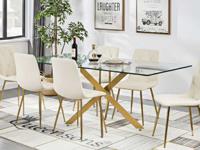 Sword Rectangular Gold Dining Table With Delhi Dining Chairs Beige