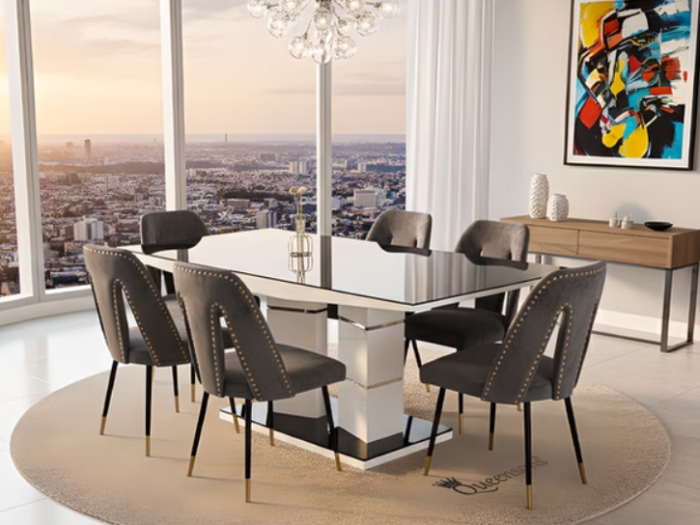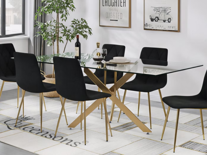 Sword Rectangular Gold Dining Table With Delhi Dining Chairs Black