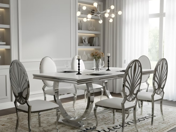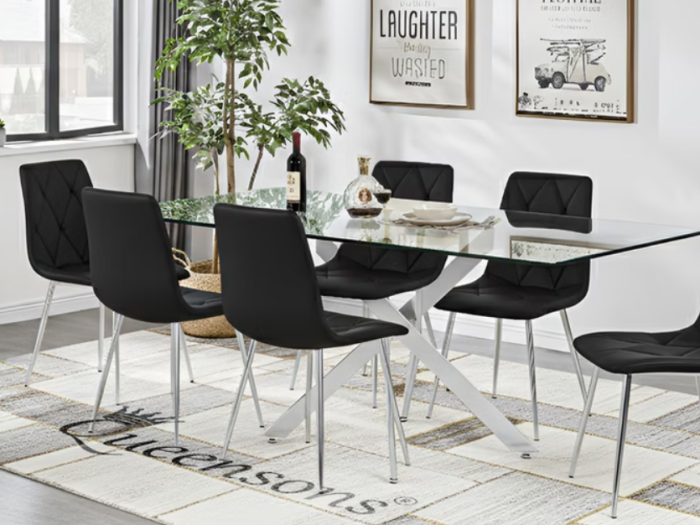Sword Rectangular Silver Dining Table With Delhi Dining Chairs Black