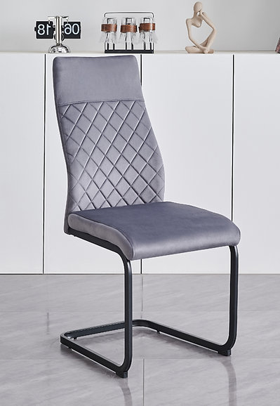 Chairs: Soft Grey Velvet with Diamond Stitching Details, C-Shaped Black Steel Base